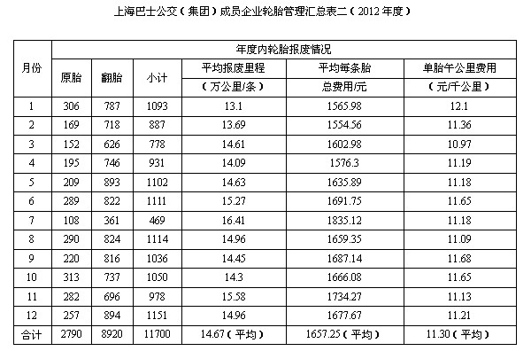 按照2012年新胎購置成本,40.2萬元可購243條輪胎。報(bào)表以充分說明上海公交對(duì)節(jié)約輪胎資源,所采取的措施、方法是相當(dāng)有成效的,有效履行企業(yè)對(duì)節(jié)約資源、_創(chuàng)建低碳社會(huì)的責(zé)任。